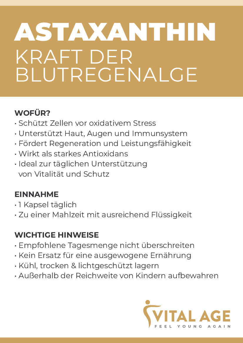 Hochdosiertes Astaxanthin aus der Blutregenalge in liposomaler Form für optimale Aufnahme.